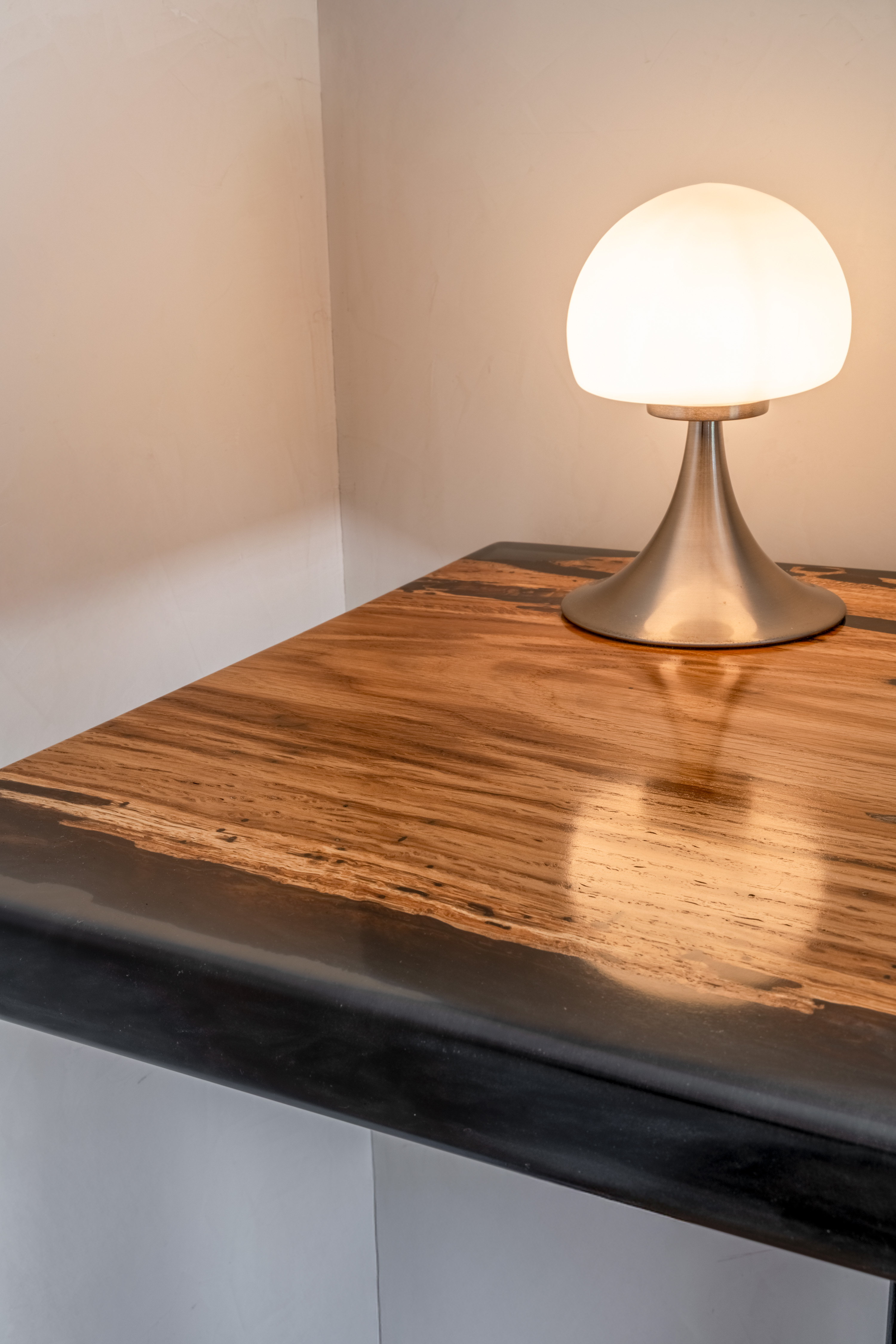 Le noir « onyx » (opaque) : c’est la finition la plus demandée. La résine est totalement saturée. L’effet est graphique, net et contemporain. C’est le choix idéal pour une table de réunion ou une table à manger design, apportant une touche de luxe statutaire.